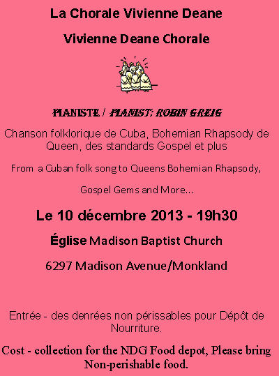 Vivienne and her trio held a Gospel concert on Saturday, November 23 at L'Église Peoples Church at Sherbrooke and Union Streets downtown.