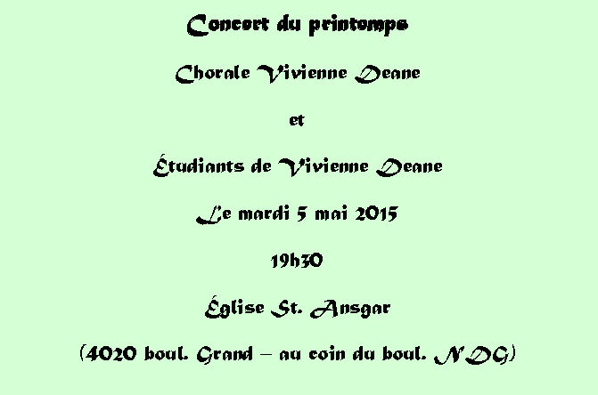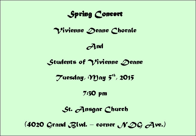 Vivienne Deane's Chorale will performed, under her direction, at St. Ansgar's Lutheran Church in N.D.G. on Tuesday, May 5, 2015 at 19:30.