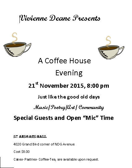 "Coffee House" Vivienne Deane's Coffee House, an evening of live music, has ended for this season. It normally runs from September to May.